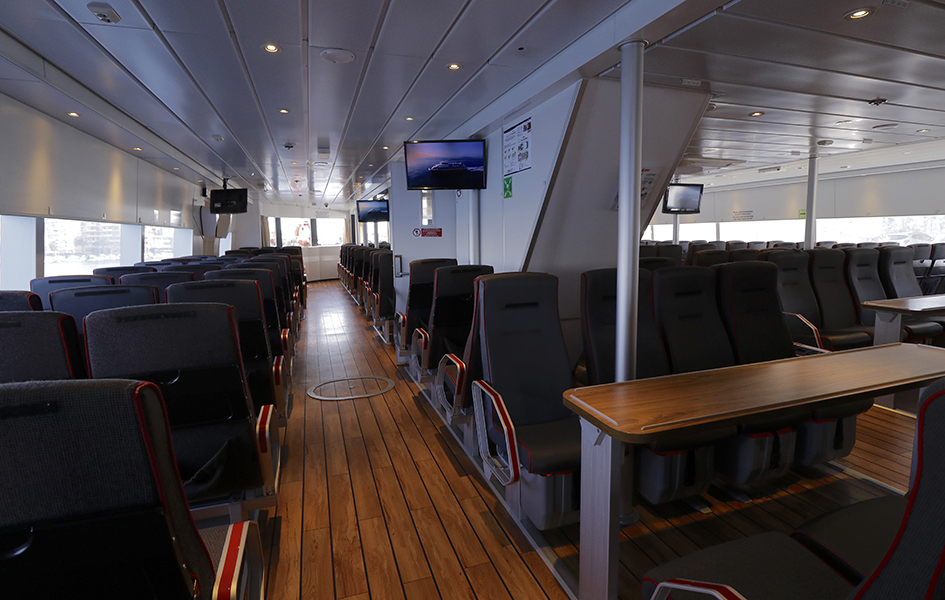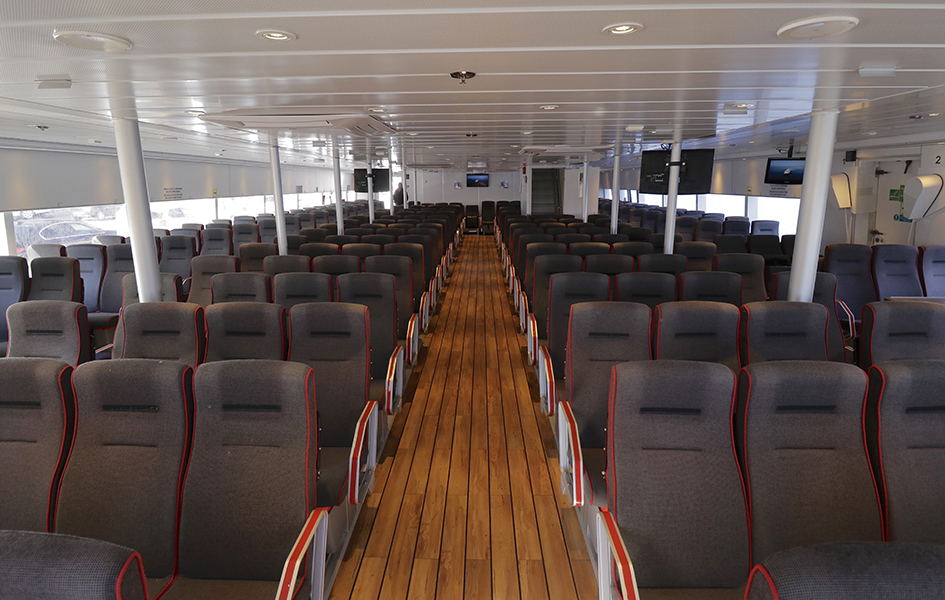 Der Salon des Katamarans bietet Platz für 250 Passagiere. Sitzanordnung: 4 Reihen à 4 Sitzplätze. Auf der Rückseite jedes Sitzes steht ein kleiner Tisch.